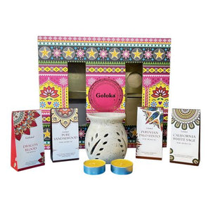 Goloka Mindful Moments Gift Set Aroma Oil Burners 4 10Ml Oils Candles. Sandalwood Palo Santo White Sage And Dragon Blood 10 Ml