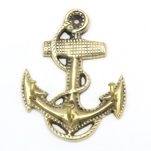 It is made of polished brass with a vintage golden finish and features a classic fouled anchor design where a rope is wrapped around the anchor's shank and stock.