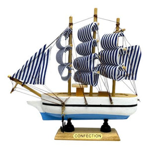 Decorative handmade wooden model of a sailing ship with a white and blue hull.
